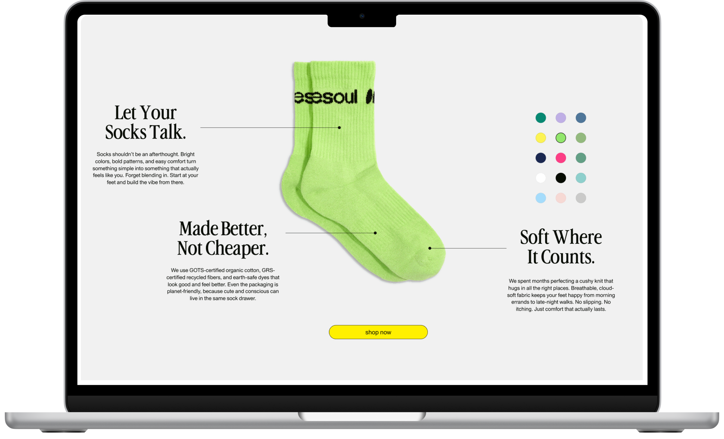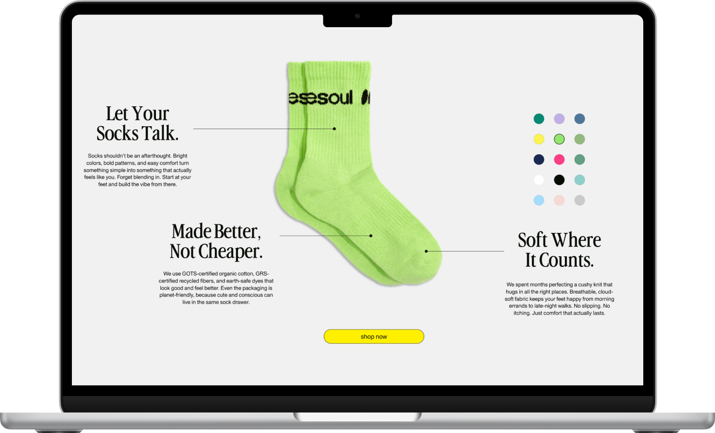 The challenge was evolving the brand’s look without losing its spirit. Doublesoul needed imagery that felt distinct and aspirational while staying true to its personality. The task was to use art direction and composition to make socks feel like fashion statements, not basics.